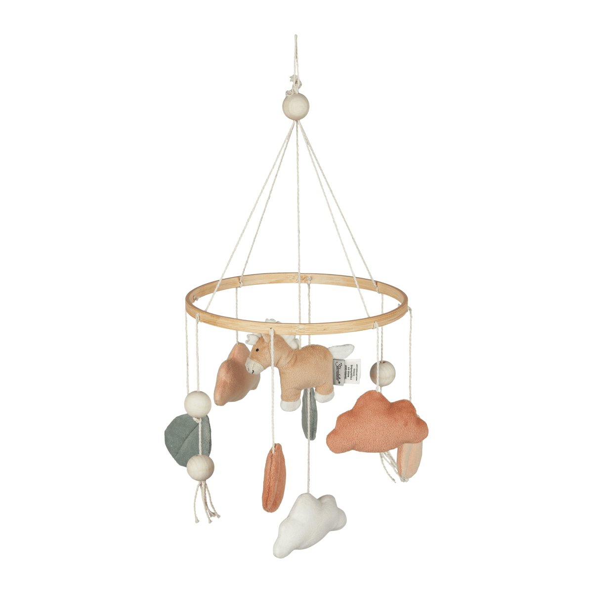 Das Mobile Pferd Sunny von Sterntaler verwandelt das Kinderzimmer in eine zauberhafte Fantasiewelt! Mit seinen liebevoll gestalteten Elementen wie Wolken, Blätter und dem niedlichen Pferd Sunny zieht es die Blicke deines Babys magisch an und lädt zum Staunen ein.