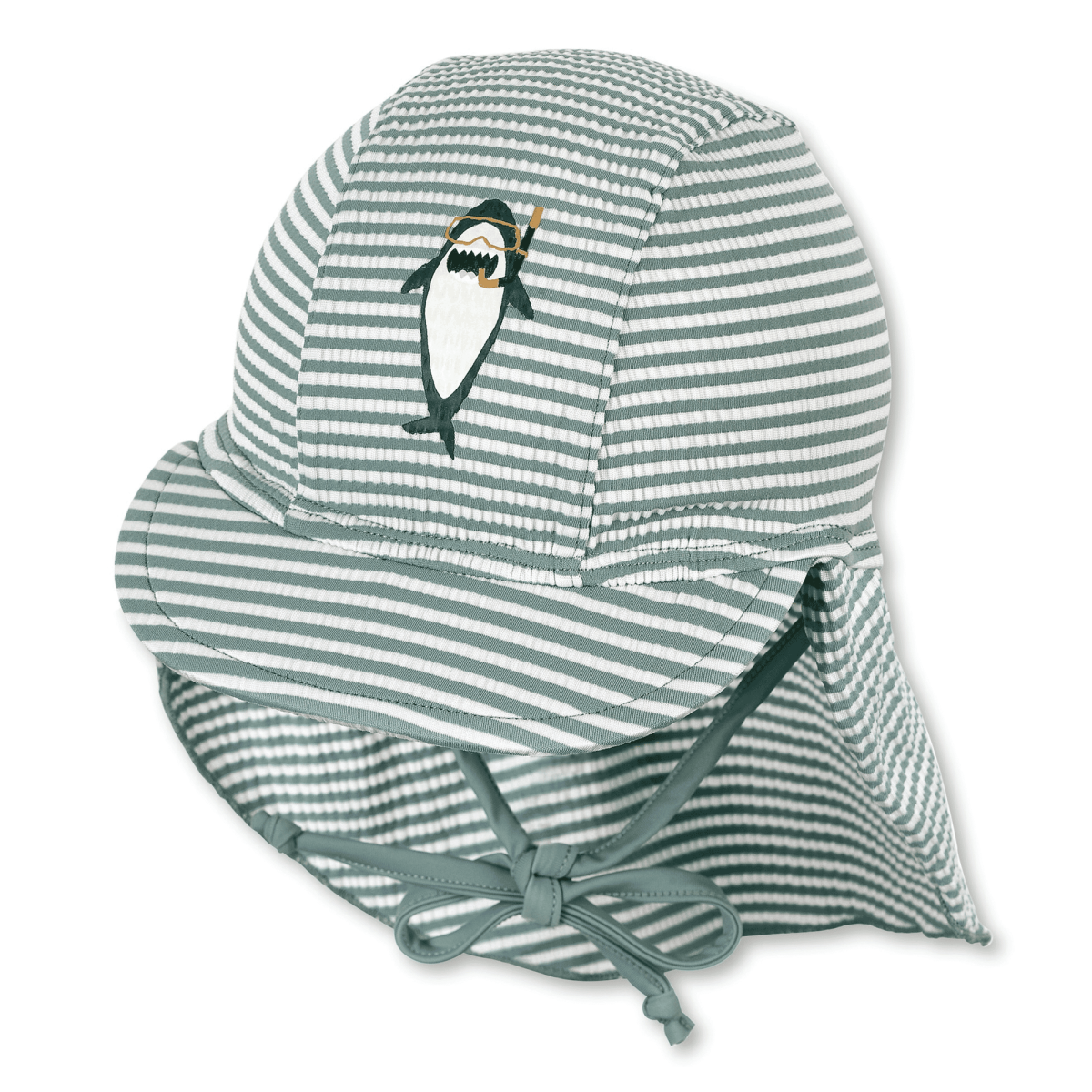 Dank des Bindebands kann die Mütze sicher unter dem Kinn deines Babys befestigt werden und ist somit ideal für Aktivitäten im Freien. Der niedliche Hai-Aufdruck macht die Mütze zu einem süßen Blickfang und rundet das Allover-Streifen-Design ab.