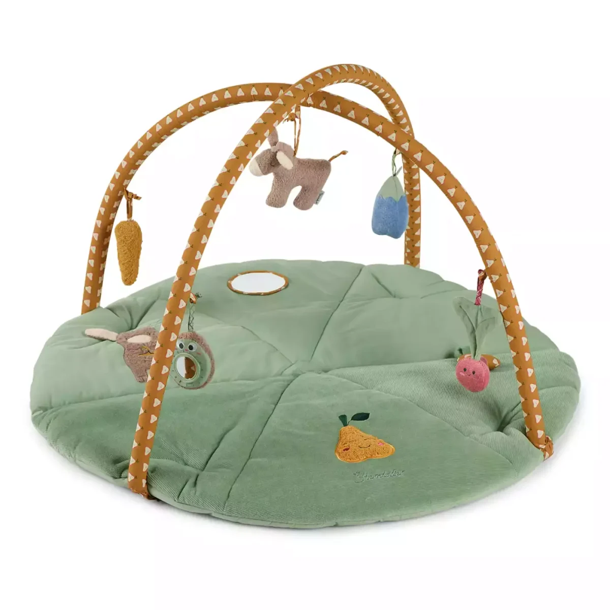 Es können unterschiedliche Materialien und Spielelemente entdeckt werden wie zum Beispiel eine Quietsche hinter dem Stickmotiv Birne oder eine Rassel in dem an der Decke befestigtem Apfel. Die niedlichen Figuren Radieschen, Aubergine, Möhre, Kiwi und Esel sind durch ihre Größe für Kinderhände sehr gut greifbar und mit Bindebänder am Spielbogen befestigt.
