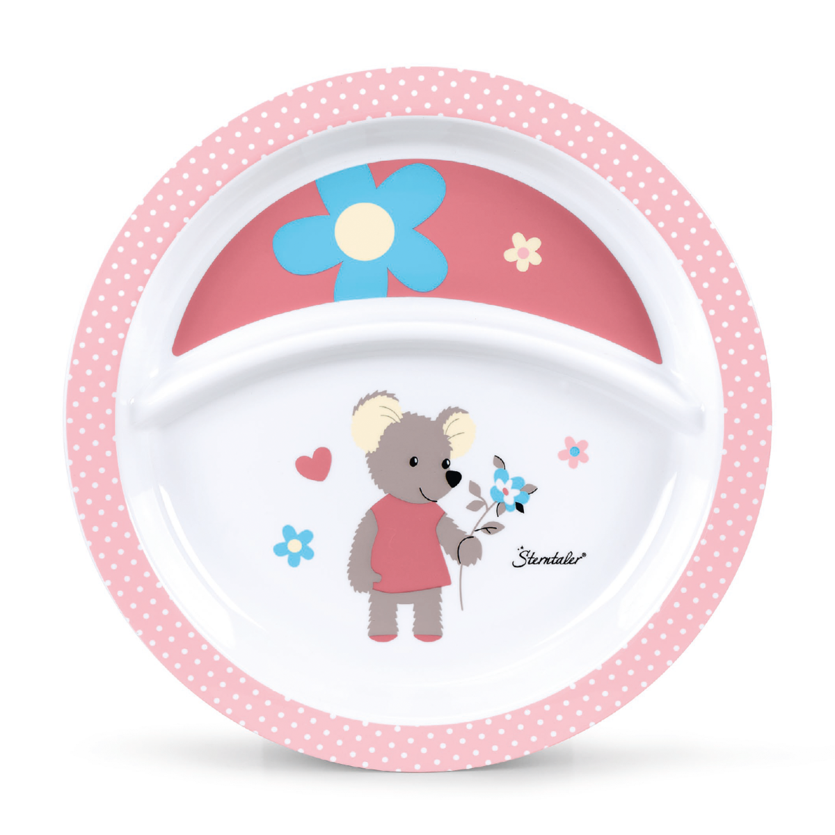 Mit dem niedlich bedruckten Teller Mabel von Sterntaler kommt Farbe auf den Tisch. Eine praktische Unterteilung hilft Speisen zu trennen. Der Teller ist aus strapazierfähigem Polypropylen gefertigt, lebensmittelecht und hat eine rutschfeste Unterseite. In der Spülmaschine kann der Teller für das nächste Lieblings-Menü deines Schatzes gereinigt werden.