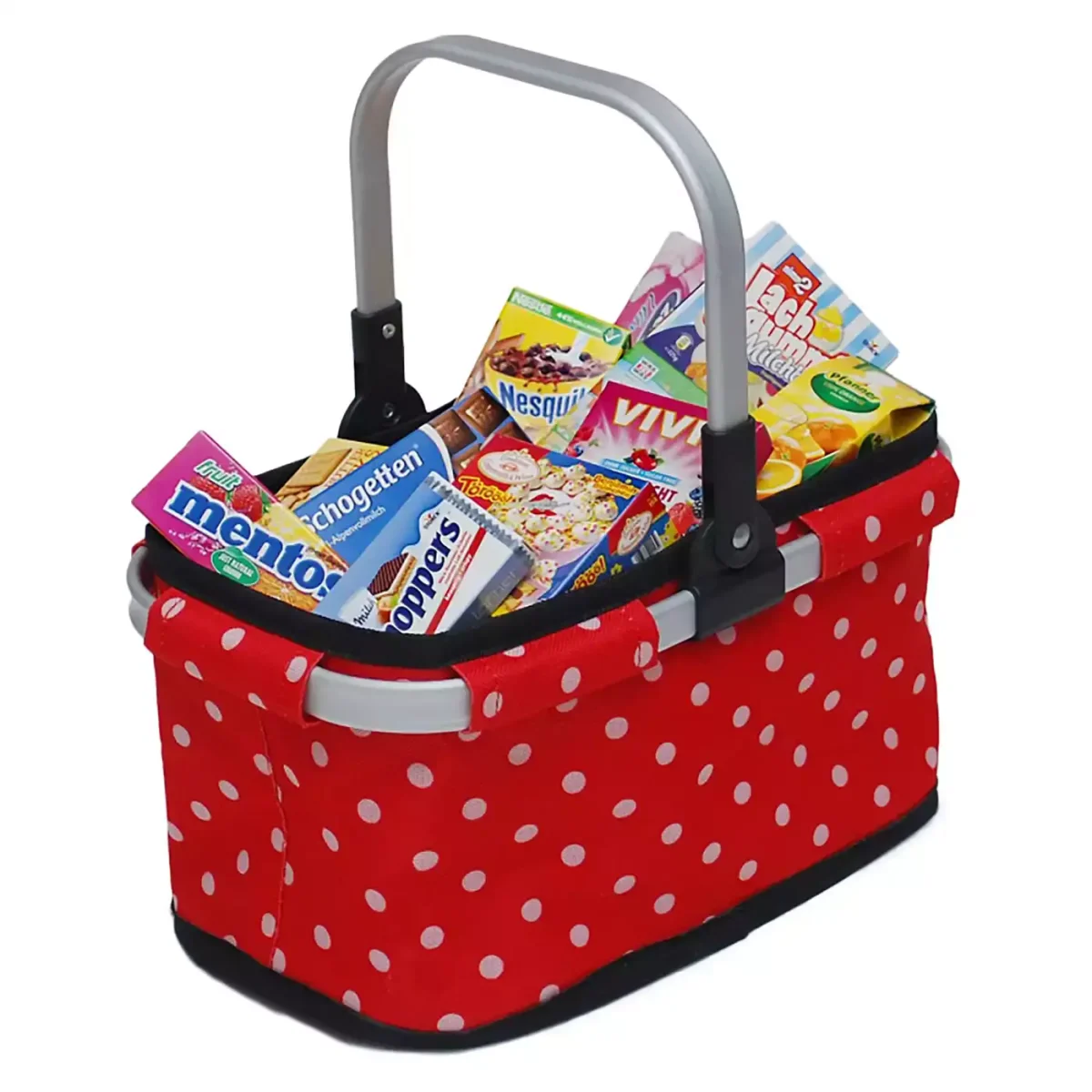 Dieser kindgerechte Tragekorb ist mit verschiedenen Markenminiaturen gefüllt und genau das Richtige für den Kinderkaufladen deines Kindes. Der gepunktete Einkaufskorb ist faltbar und groß genug für den Gang durch den hauseigenen Kaufladen im Kinderzimmer.