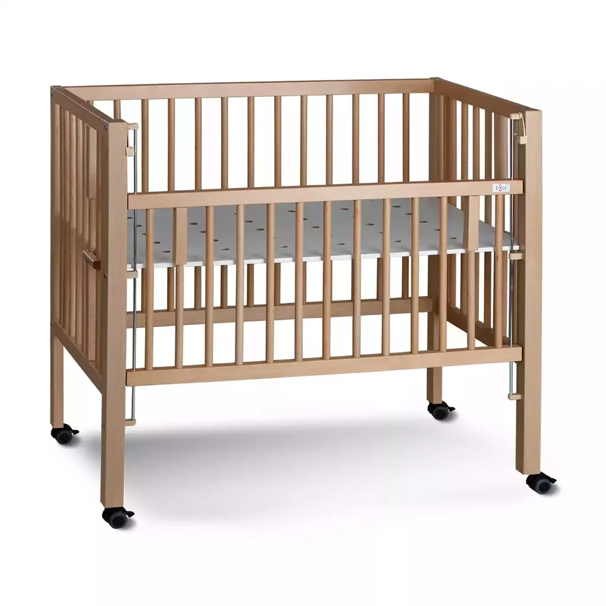 Aus massivem Buchenholz gefertigt ist das tiSsi® Beistellbett besonders stabil. „Maxi“ steht hierbei für eine etwas größere Liegefläche, um es noch länger nutzen zu können. Zudem unterstützen die vier angebrachten und feststellbaren Parkett-Rollen eine optimale Position. Durch das Anstellbett von tiSsi® hast du deinen Nachwuchs auch in der Nacht immer bei dir, was auch dir einen merkbar besseren Schlaf beschert. Der perfekte Begleiter von Anfang an! Durch das mitgelieferte Verschlussgitter kannst du das tiSsi®-Anstellbett mit nur zwei Handgriffen zum Stubenwagen oder vollwertigem Kinderbett umfunktionieren.