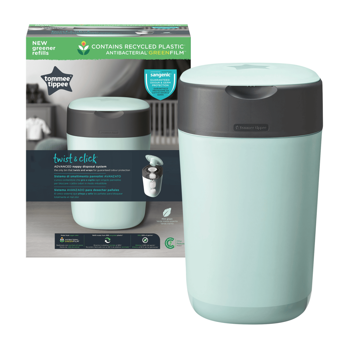 Die mehrlagige antibakterielle GREENFILM™-Folie ist biobasiert und besteht aus nachhaltig bezogenem Zuckerrohr. Bei Berührung tötet diese Folie ca. 99% aller gefährlichen Keime wie E. coli und Staphylococcus aureus ab. Um die Auswirkungen auf die Umwelt zu reduzieren, besteht der Windeleimer sowie die Nachfüllkassette aus ca. 98% recyceltem und vollständig recycelbarem Plastik.
