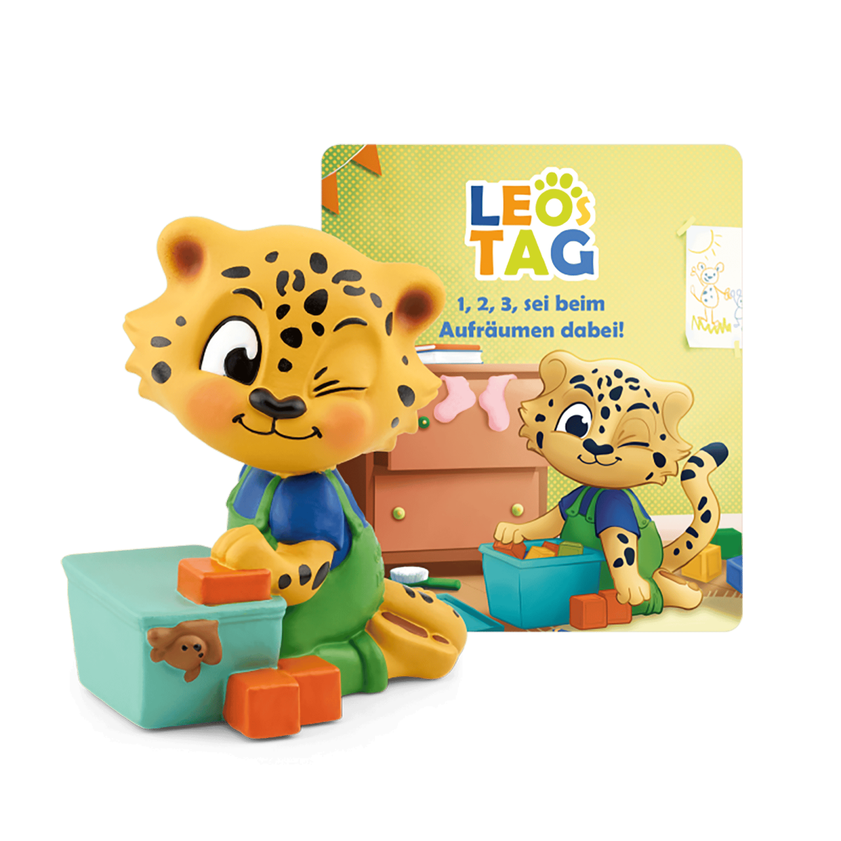 Handbemalte Hörfigur für die Toniebox „Leos Tag – 1, 2, 3, sei beim Aufräumen dabei!“.