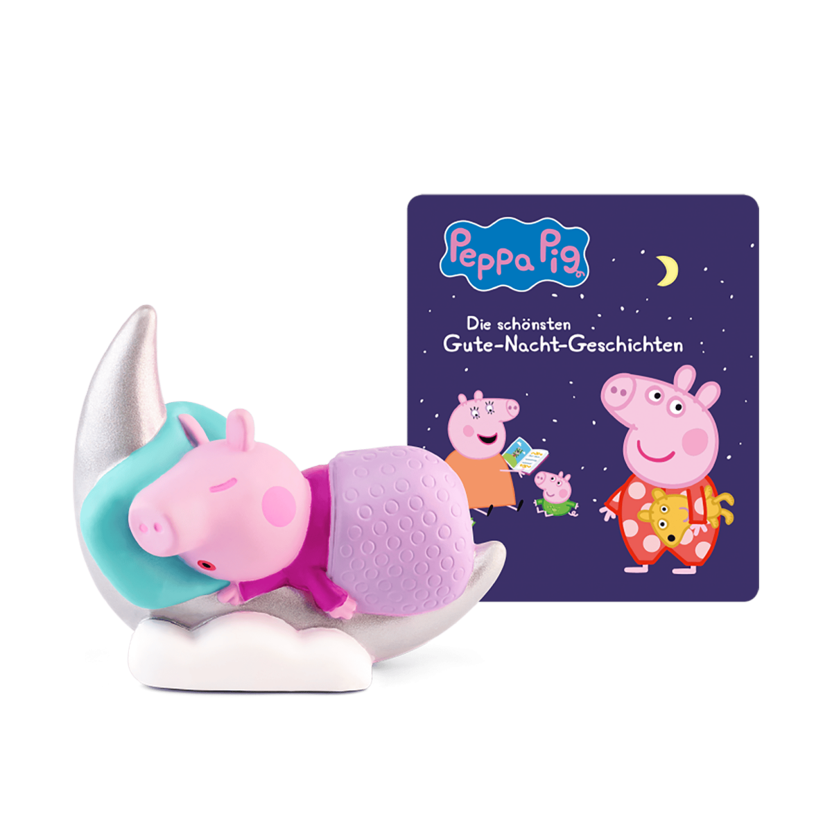 Handbemalte Hörfigur für die Toniebox „Peppa Pig – Die schönsten Gute-Nacht-Geschichten“. Kurze Geschichten für große Schweinchen-Fans – Peppa und ihre Familie und Freunde kommen auf die Toniebox! Sie ist klein, pink und liebt Matschepfützen über alles: Peppa Wutz begeistert mit ihren kurzen Geschichten schon die kleinsten Hörspielfans.