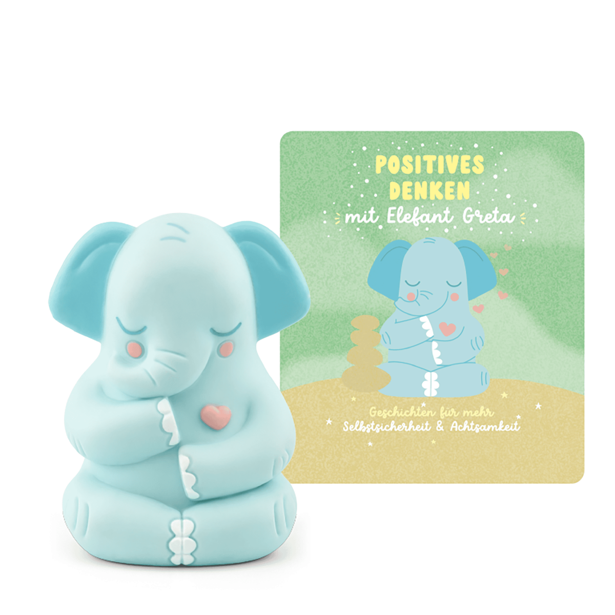 Handbemalte Hörfigur für die Toniebox „Positives Denken mit Elefant Greta – Geschichten für mehr Selbstsicherheit und Achtsamkeit“.