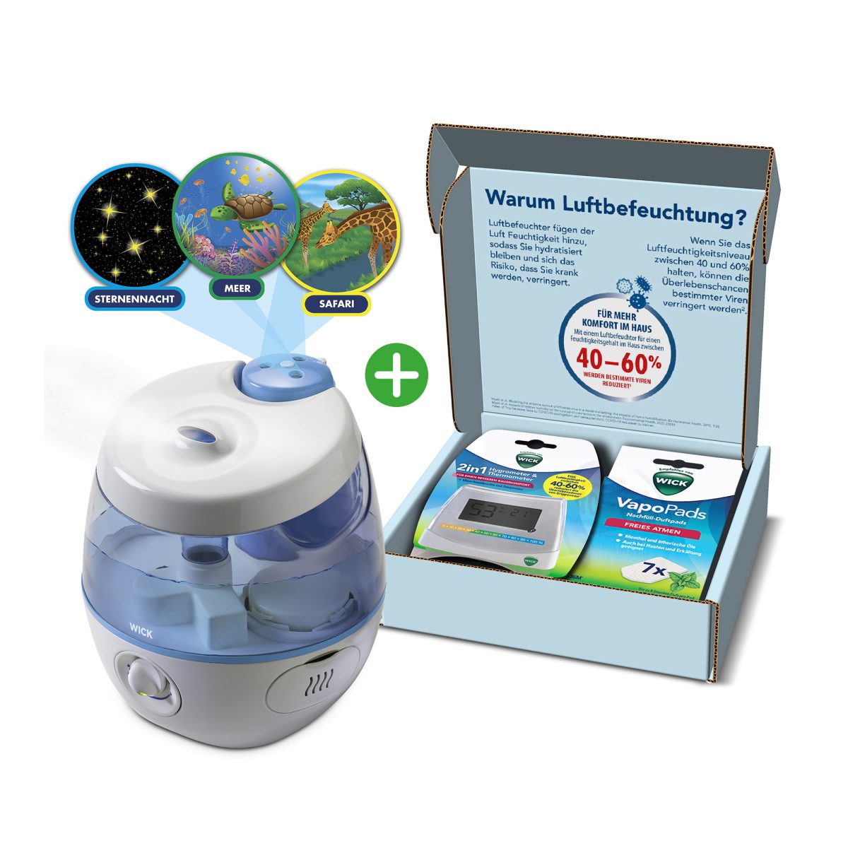 Das Wick Starter Kit 2-in-1 besteht aus einem Hygrometer inkl. Thermometer und einer Packung VapoPads Menthol. Dieses Set unterstützt dabei die relative Luftfeuchtigkeit in Innenräumen zwischen 40-60 % zu halten. Das ist der optimale Bereich ist, um das Überleben von Grippeviren auf Oberflächen und in der Luft zu reduzieren. So weisst du immer, wie du deinen Luftbefeuchter optimal einsetzen musst.