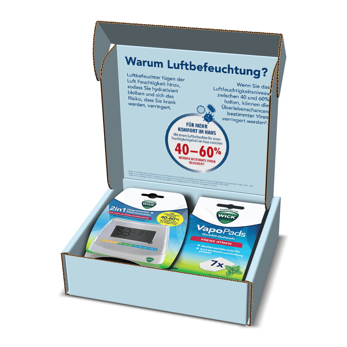 Das Wick Starter Kit 2-in-1 besteht aus einem Hygrometer inkl. Thermometer und einer Packung VapoPads Menthol. Dieses Set unterstützt dabei die relative Luftfeuchtigkeit in Innenräumen zwischen 40-60 % zu halten. Das ist der optimale Bereich ist, um das Überleben von Grippeviren auf Oberflächen und in der Luft zu reduzieren. So weisst du immer, wie du deinen Luftbefeuchter optimal einsetzen musst.