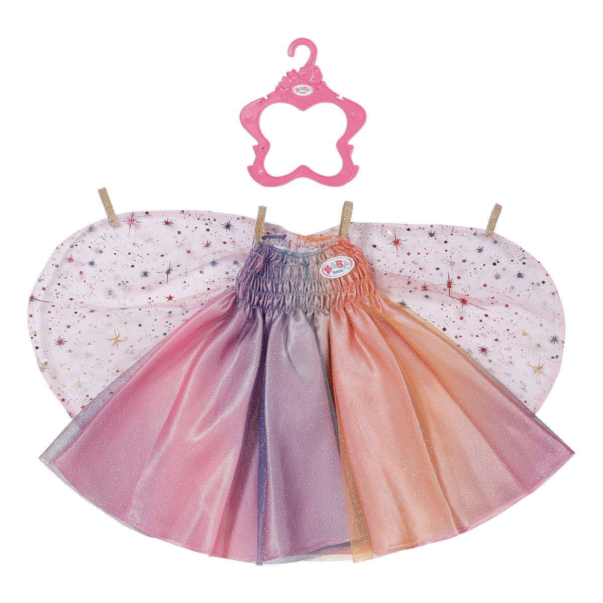 Mit seinem gerafften Oberteil, den angenähten Flügelchen und kleinen Fingerlaschen für Puppenhände ist es nicht nur wunderschön, sondern auch super funktional gestaltet. Die zarten Farben machen das Kleid zu einem echten Hingucker und lassen jede BABY born zur Regenbogenfee werden – für unvergessliche Spielmomente voller Fantasie!